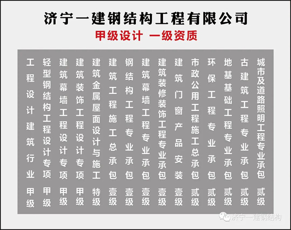 濟(jì)寧一建鋼結(jié)構(gòu)工程有限公司,隸屬中煤建設(shè)集團(tuán),集團(tuán)注冊(cè)資金1.0158億元人民幣,下設(shè)工程部、設(shè)計(jì)部、技術(shù)部、質(zhì)檢部、生產(chǎn)部、安全部。擁有鋼結(jié)構(gòu)施工、設(shè)計(jì)雙甲資質(zhì)、制造壹級(jí)資質(zhì),幕墻施工、設(shè)計(jì)雙甲資質(zhì),裝飾裝修施工、設(shè)計(jì)雙甲資質(zhì),建筑金屬屋面設(shè)計(jì)與施工特級(jí)資質(zhì),門(mén)窗施工壹級(jí)資質(zhì),并具有對(duì)外承包施工資質(zhì)和勞務(wù)輸出資質(zhì)等九項(xiàng)國(guó)家甲級(jí)資質(zhì)。主要從事鋼結(jié)構(gòu)網(wǎng)架工程、管桁架工程、裝配式輕鋼別墅工程、膜結(jié)構(gòu)工程及大型儲(chǔ)罐工程的設(shè)計(jì)、生產(chǎn)與施工,公司相繼承攬了機(jī)場(chǎng)航站樓、體育場(chǎng)館、省級(jí)科技館、大型廠房、高速路服務(wù)站、國(guó)家石油儲(chǔ)庫(kù)、加油站、儲(chǔ)煤倉(cāng)等各類(lèi)工程,施工范圍涉及全國(guó)三十多個(gè)省、市、自治區(qū)及直轄市,工程質(zhì)量合格率100%,多年來(lái)榮獲國(guó)內(nèi)建筑界各類(lèi)獎(jiǎng)項(xiàng)100余個(gè)。