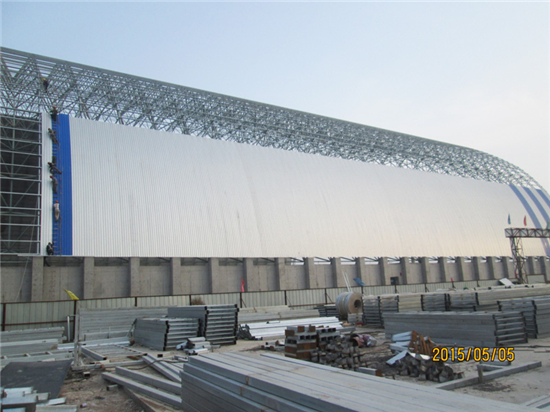 茌平信源鋁業(yè)干煤棚網(wǎng)殼工程此工程總展開建筑面積約為8萬平方米。其中網(wǎng)架重量約為3000噸,網(wǎng)殼跨度112米,矢高40.669米,總長度600米。本次工程施工難度極大,在山東省屬于首屈一指的項目,而我司已經(jīng)全部完成網(wǎng)架的車間制作、現(xiàn)場的拼裝,為我司施工史上增添又一輝煌!